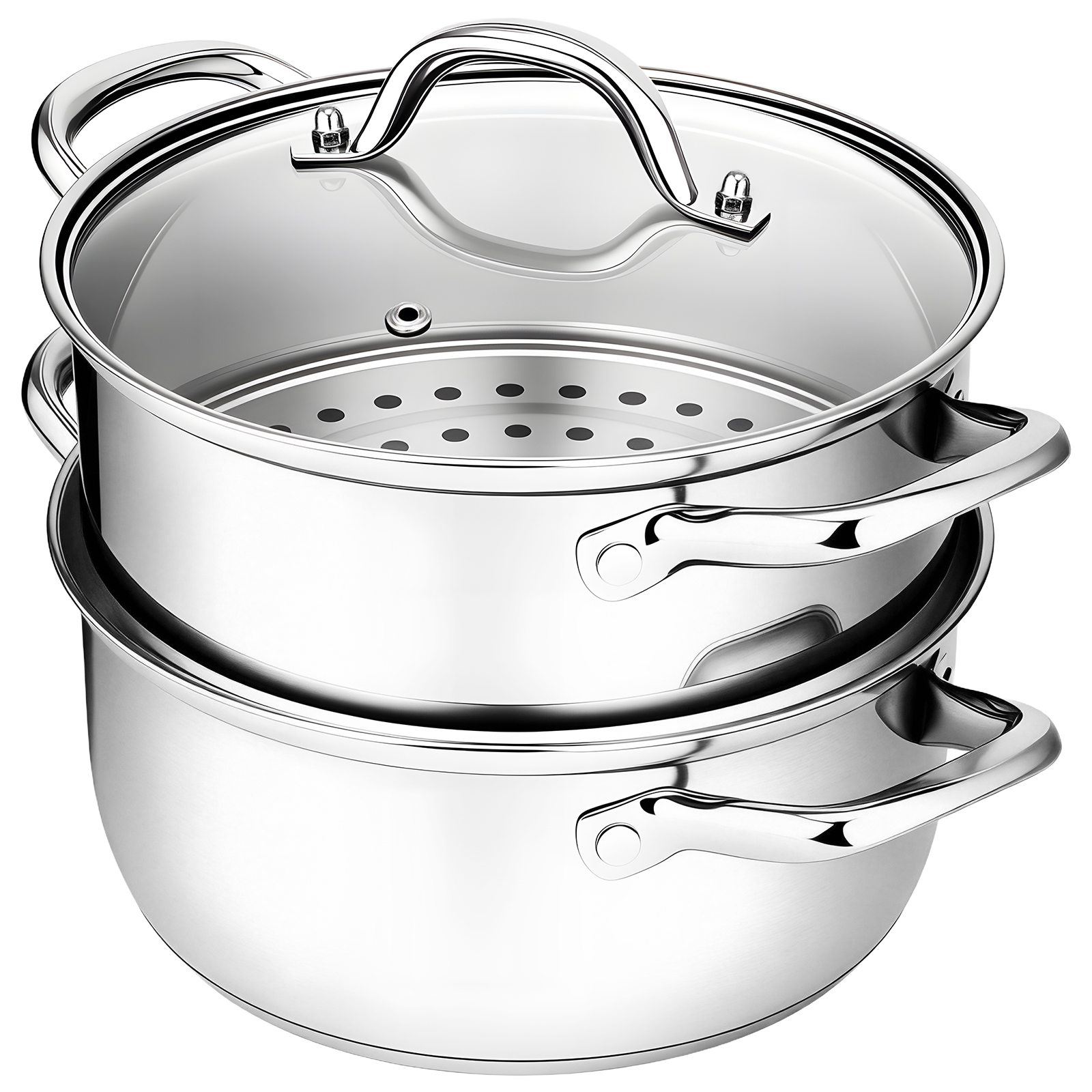 - Tri-Ply Bottom Construction: This steamer pot features a 3-layer composite bottom (stainless steel, aluminum, magnetic stainless steel). The aluminum core of the stainless steel pot absorbs heat rapidly, while stainless steel ensures uniform heat distribution. This design of the food steamer achieves fast heating and consistent cooking, making the steamer cookware energy-efficient. With excellent resistance and corrosion resistance, the steam pot maintains durability and resists warping.